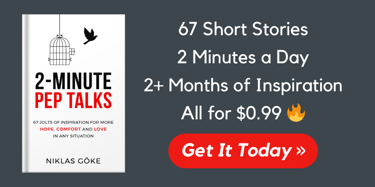 Here's a short blurb. Oh, and if you want a PDF version, just send me your receipt, and I'll give you one! 2-Minute Pep Talks is a collection of 67 jolts of inspiration for more hope, comfort, and love in any situation. With over 2 months of daily inspiration across 5 categories, 2-Minute Pep Talks will make you feel more comfortable in your own skin, remind you to love yourself enough to ask life for what you truly want, and provide you with the world's scarcest resource: hope. Whether you're looking for a pick-me-up, new perspectives, or more fuel to accomplish your dreams — if you're ready to regain that light, passionate, optimistic feeling we all used to have as children, this book is for you.